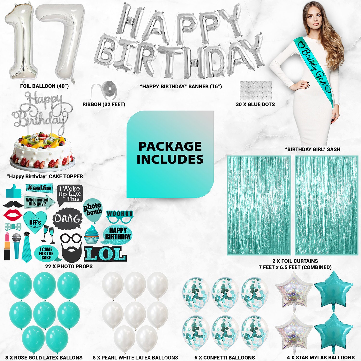 17th Birthday Decorations With Photo Props 17 Birthday Party Supplies 17 Cake Topper Rose Gold Banner Teal Green Confetti Balloons Gift Etsy